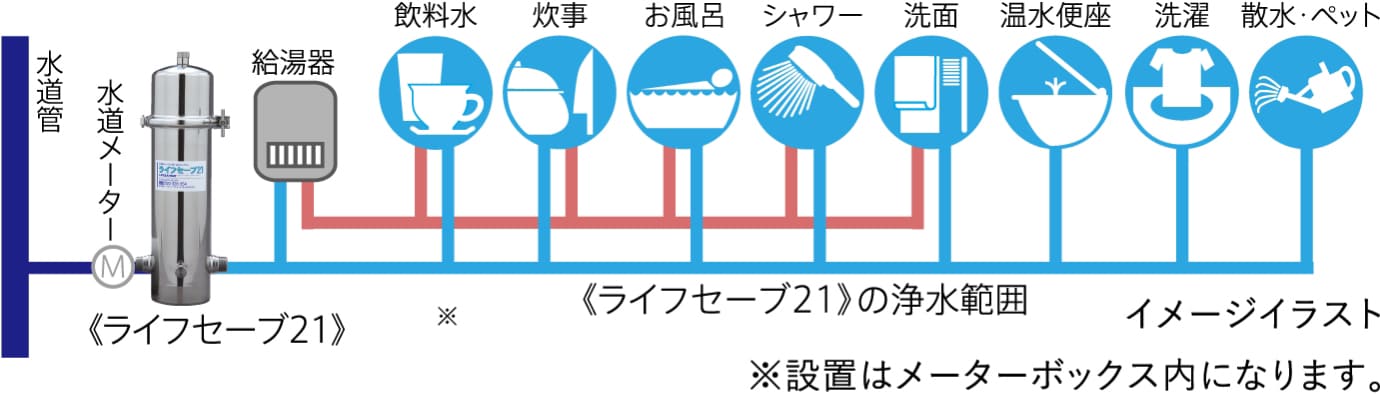 大型活性炭フィルターが残留塩素を測定限界以下まで除去。各住戸のメーターボックス内(元栓近く)に設置するため、温水になる前に洗浄します。飲用水。キッチンはもちろん、シャワーやお風呂でも浄水したお湯がふんだんに利用できます。